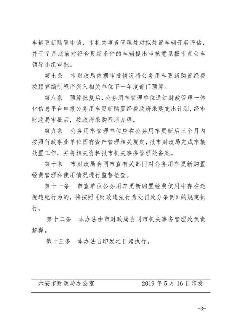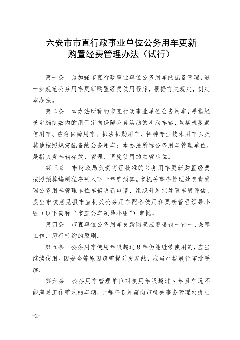 六安市财政局 六安市机关事务管理处关于印发《六安市市直行政事业单位公务用车更新购置经费管理办法(试行)》 的通知