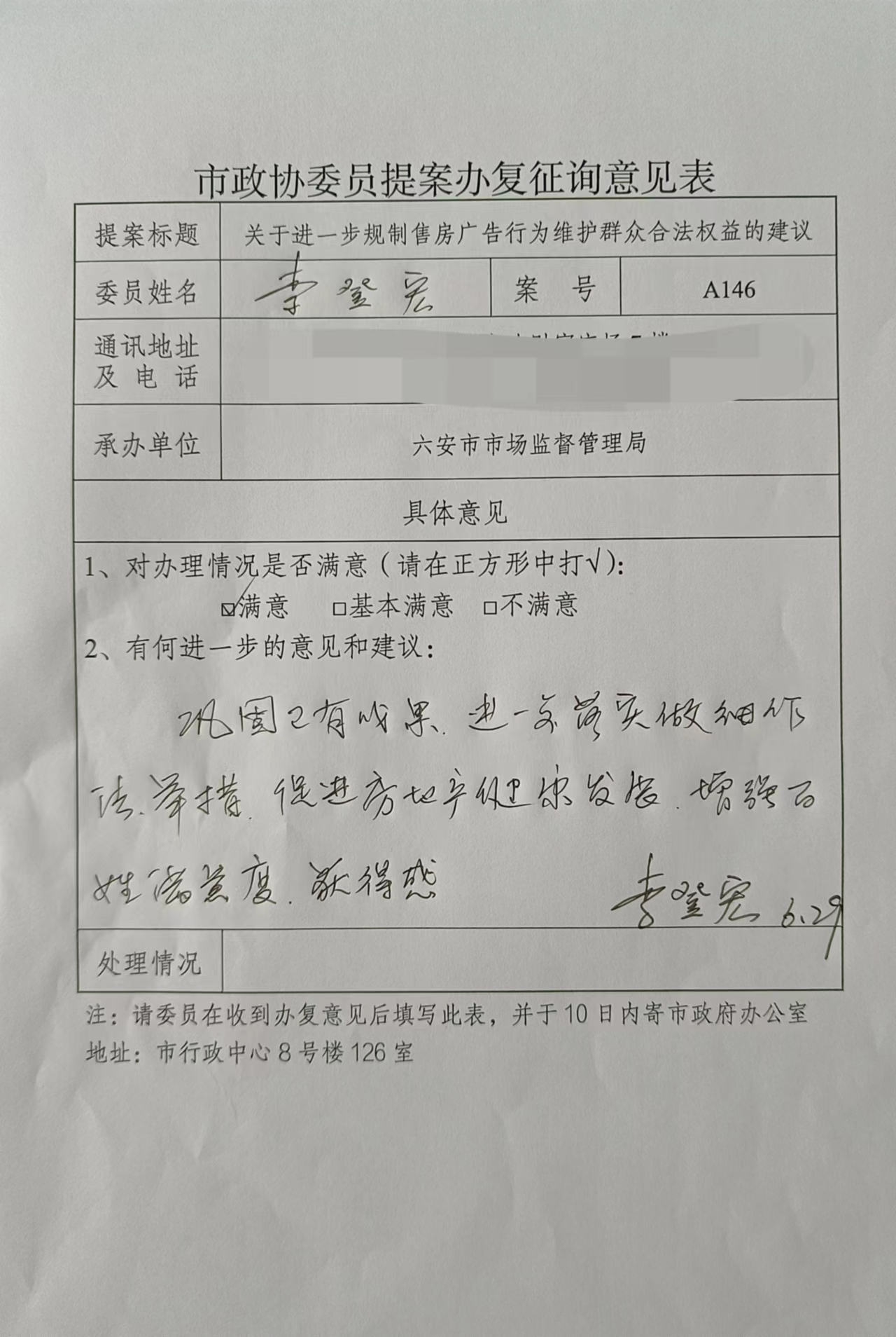 关于市政协六届二次会议第A146号代表建议办理情况的函和办复征询意见表