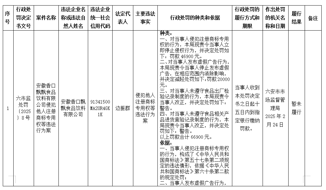 六安市市场监督管理局行政处罚案件信息公开表六市监处罚〔2025〕8号