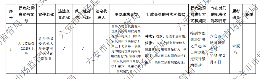 六安市市场监督管理局行政处罚案件信息公开表六市监处罚〔2025〕9号