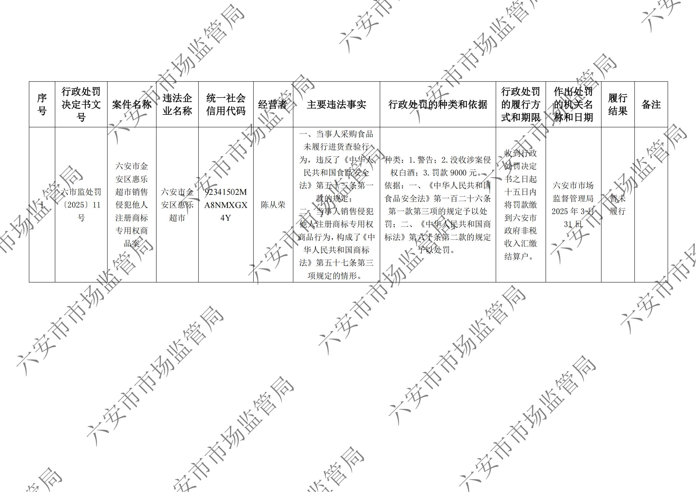 六安市市场监督管理局行政处罚案件信息公开表六市监处罚〔2025〕11号