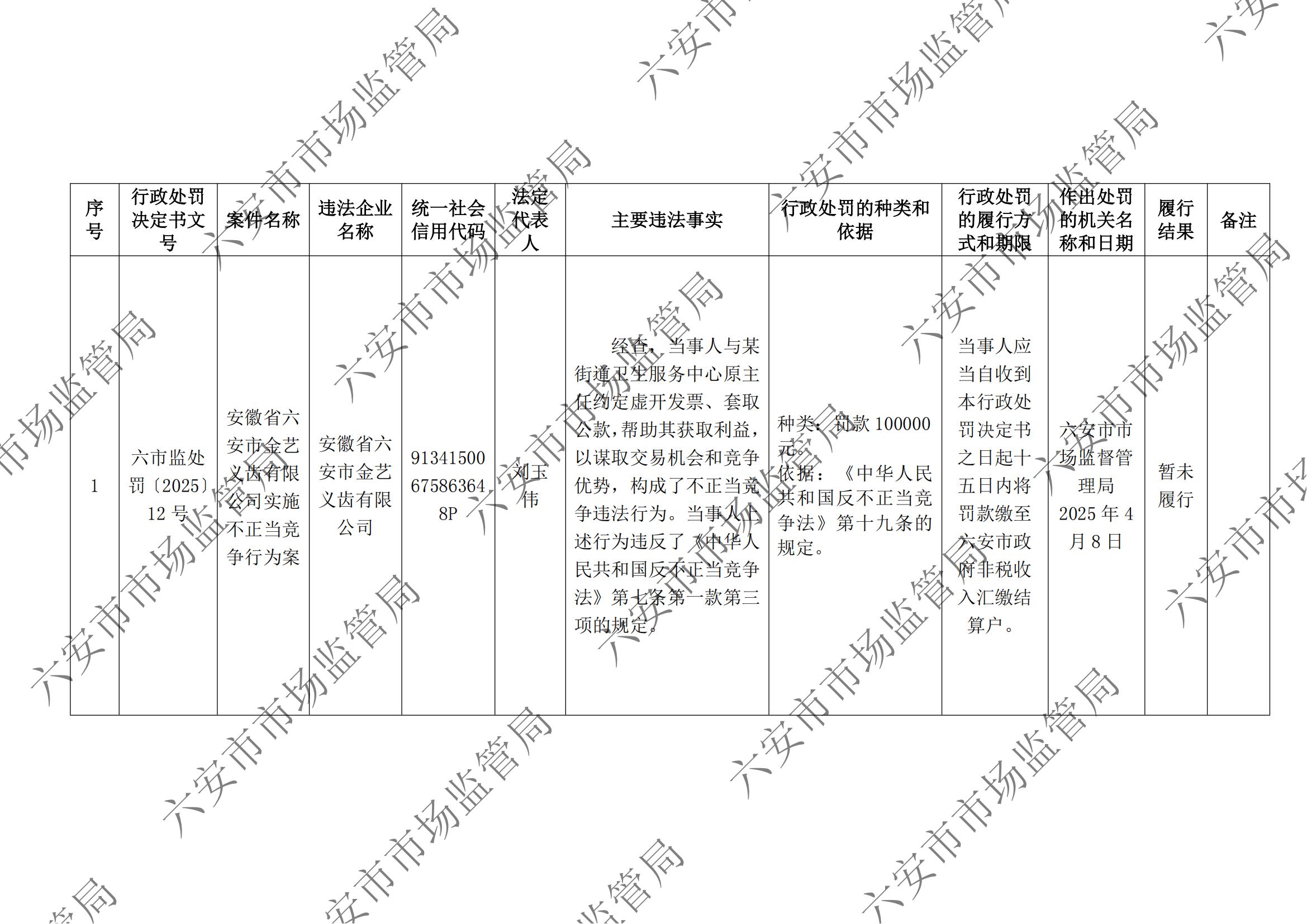 六安市市场监督管理局行政处罚案件信息公开表六市监处罚〔2025〕12号