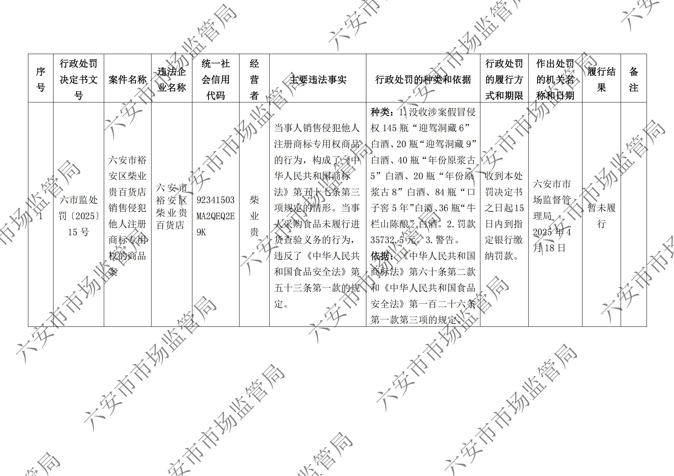 六安市市场监督管理局行政处罚案件信息公开表六市监处罚〔2025〕15号
