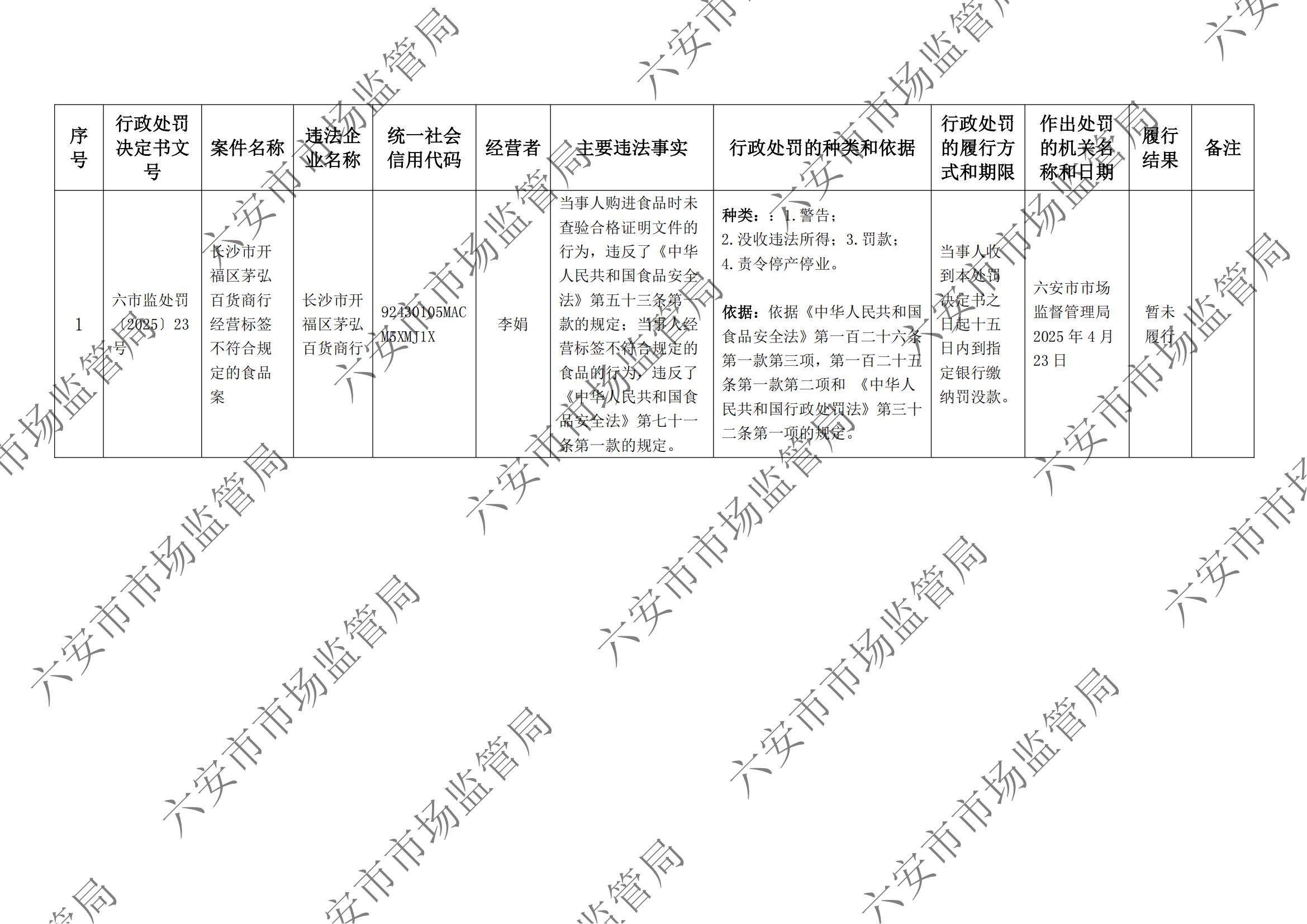 六安市市场监督管理局行政处罚案件信息公开表六市监处罚〔2025〕23号