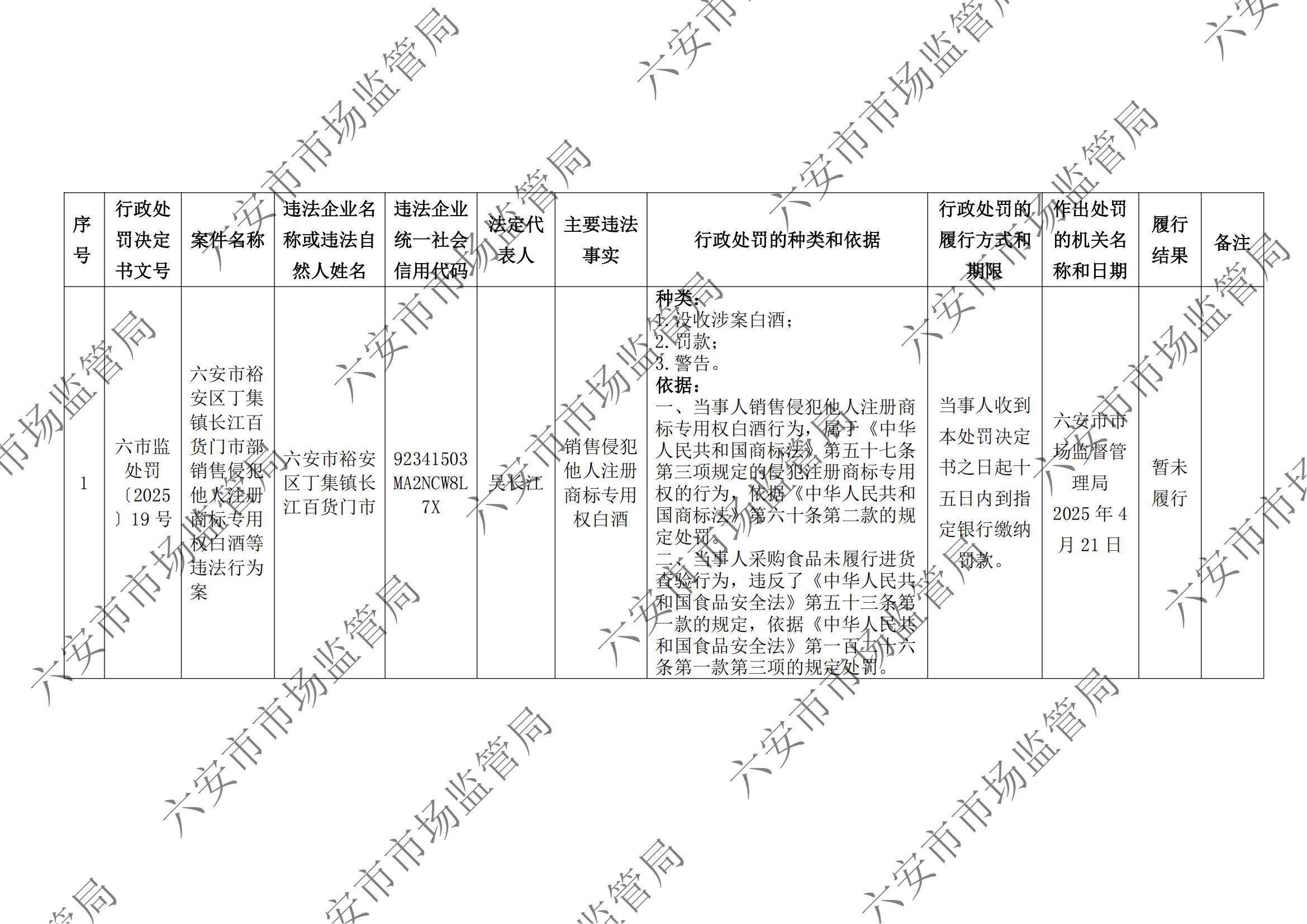 六安市市场监督管理局行政处罚案件信息公开表六市监处罚〔2025〕19号