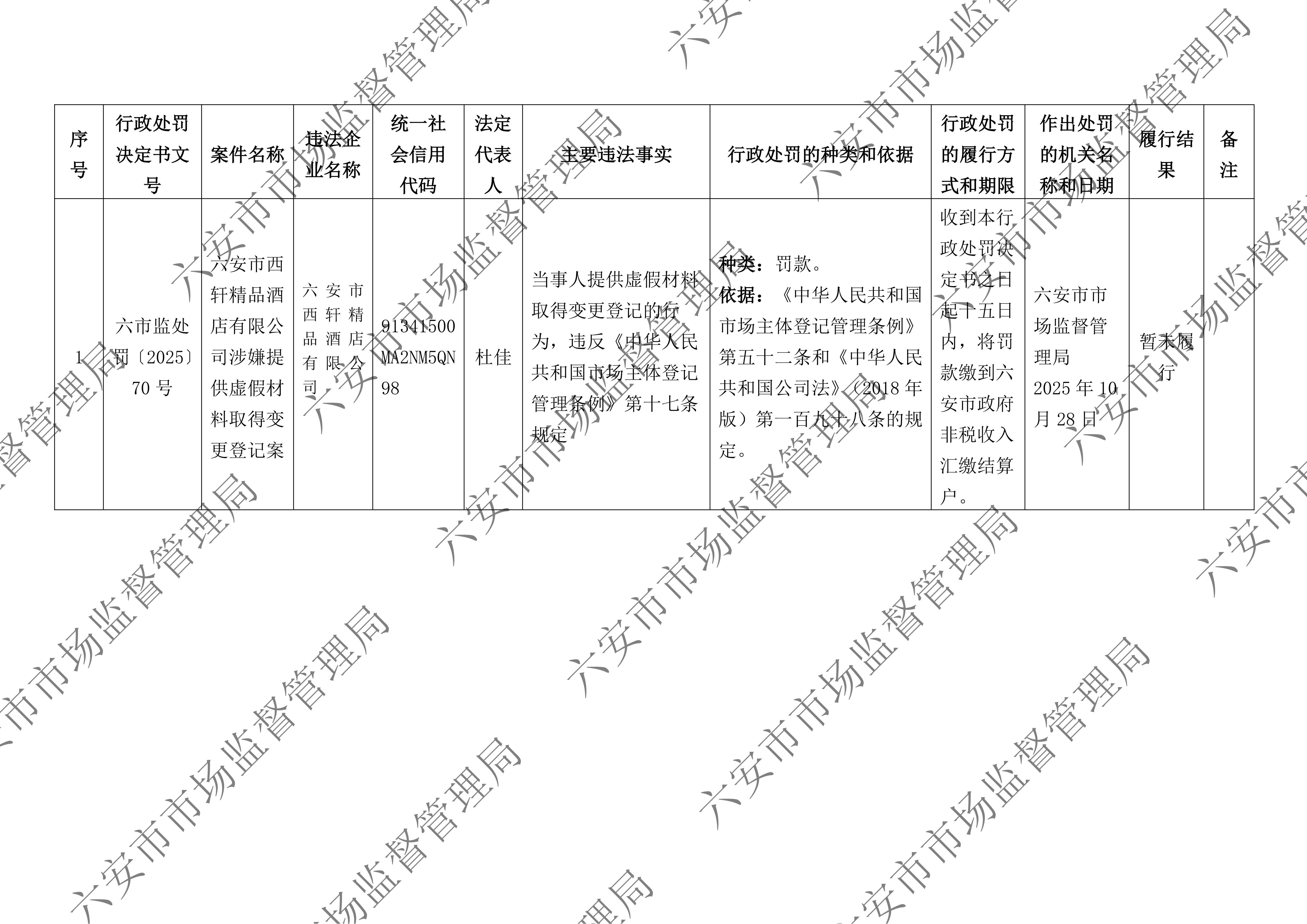 六安市市场监督管理局行政处罚案件信息公开表六市监处罚〔2025〕70号