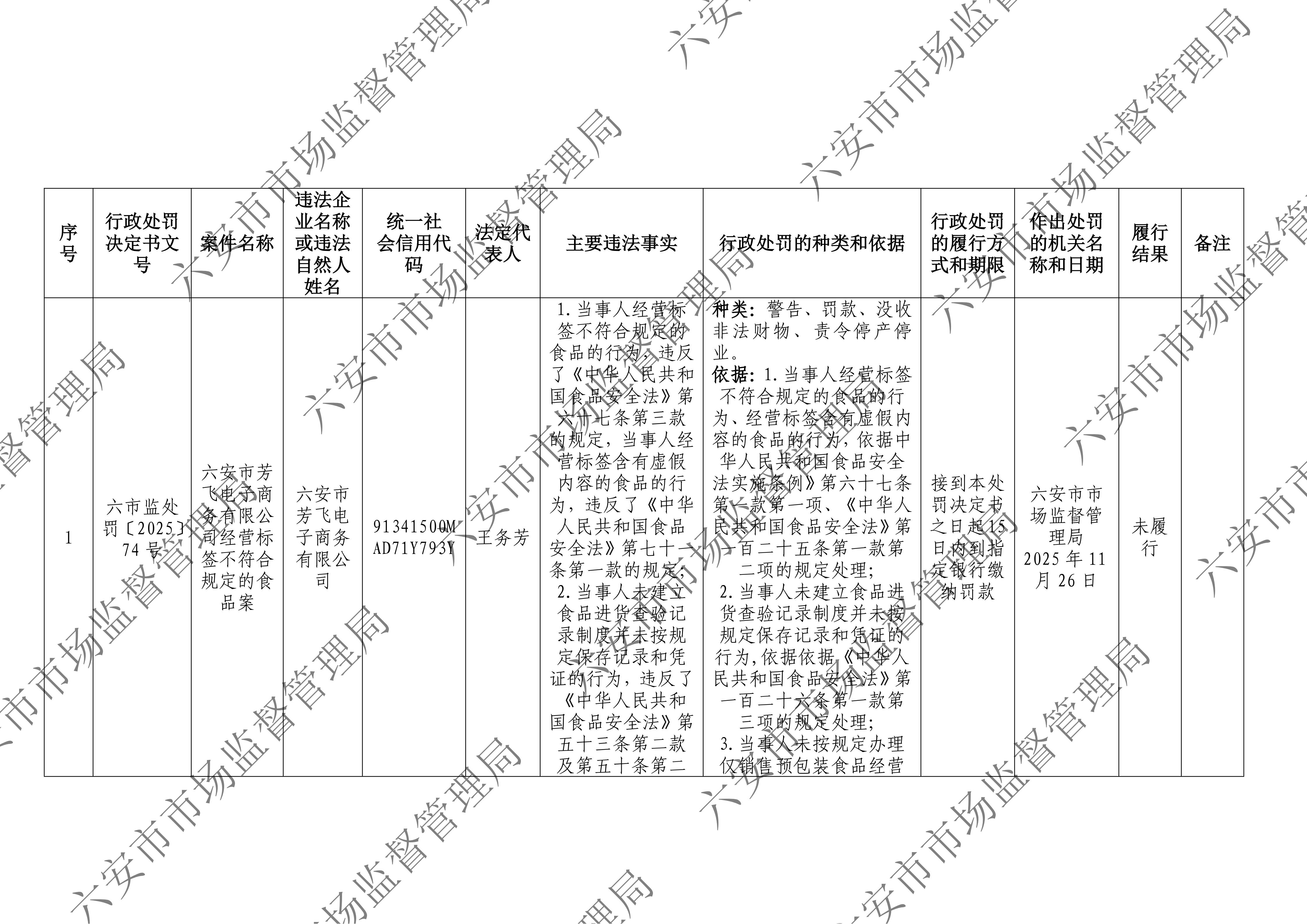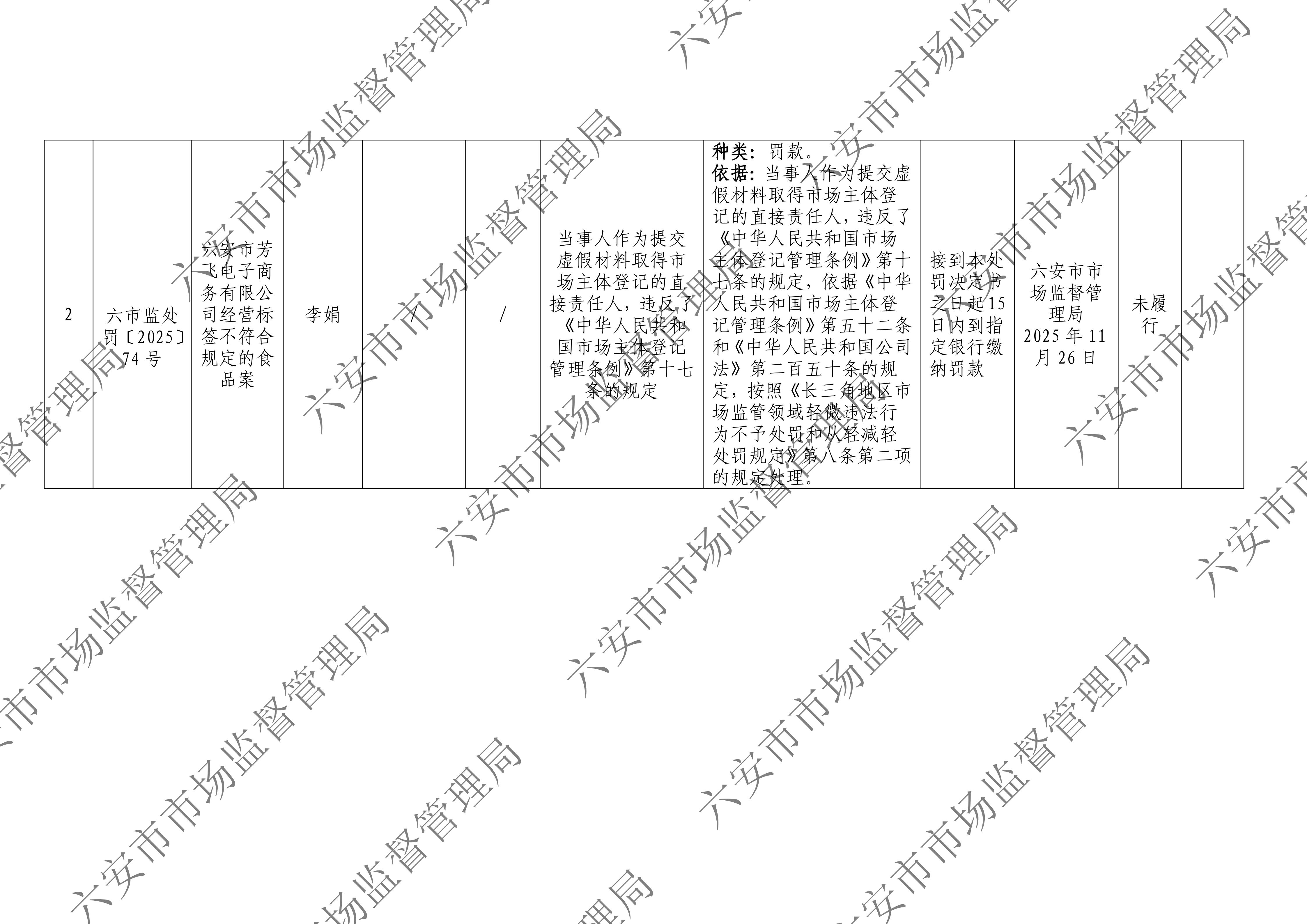 六安市市场监督管理局行政处罚案件信息公开表六市监处罚〔2025〕74号