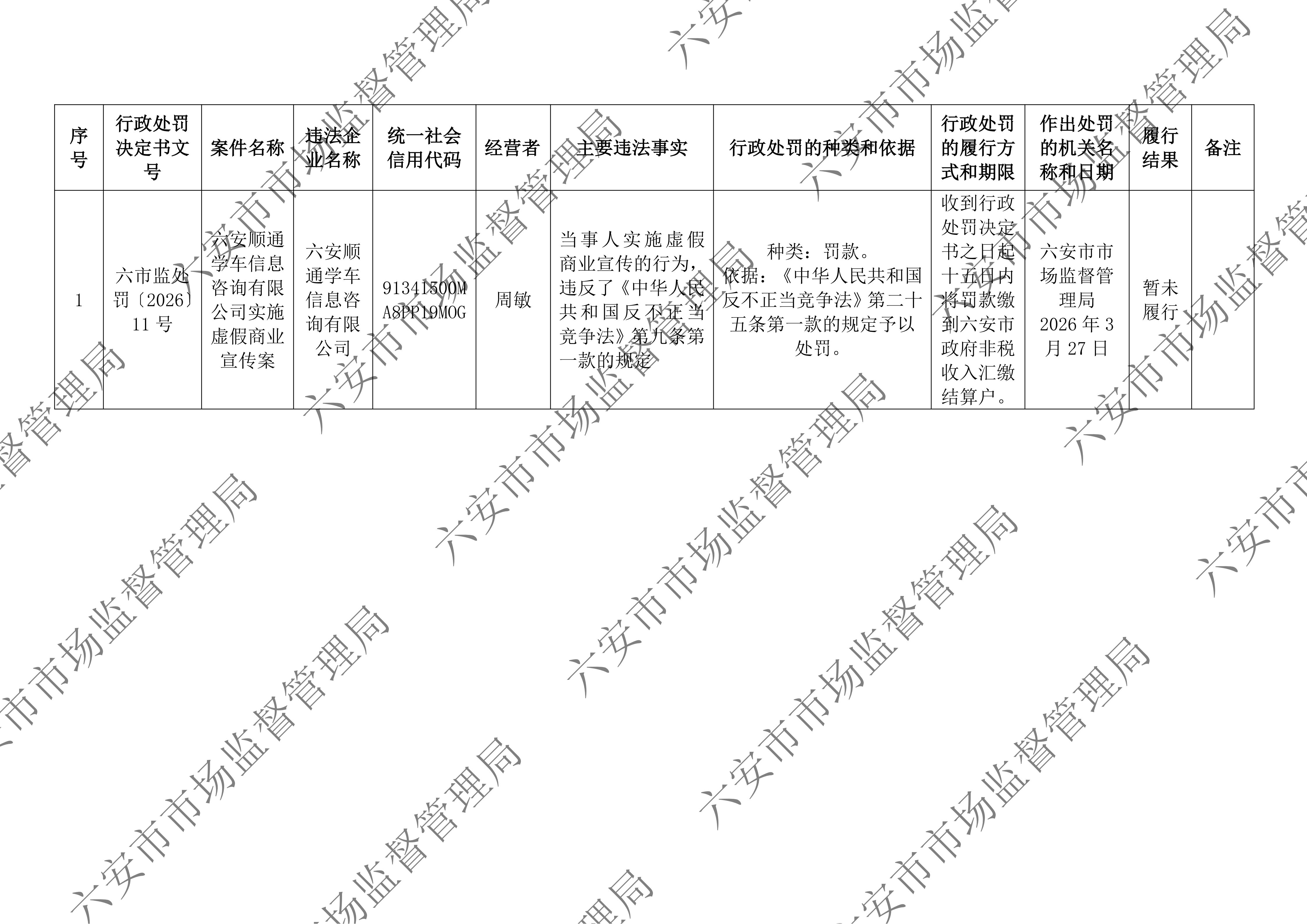 六安市市场监督管理局行政处罚案件信息公开表六市监处罚〔2026〕11号
