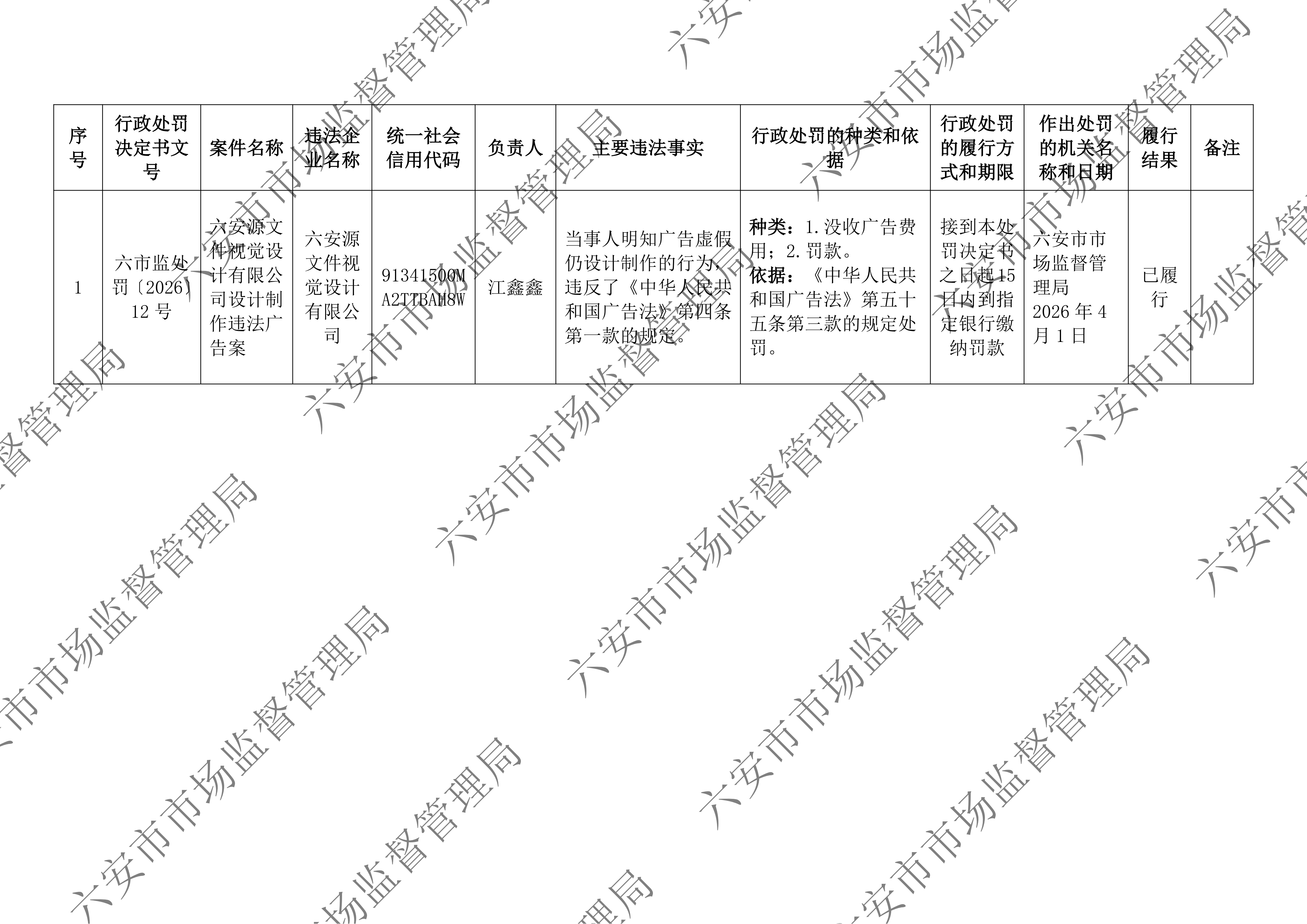六安市市场监督管理局行政处罚案件信息公开表六市监处罚〔2026〕12号