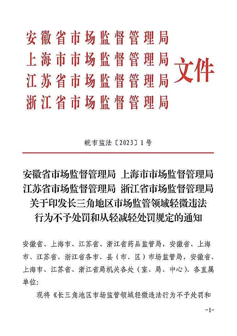 为推动长三角地区经济高质量、一体化发展,推进市场监管领域包容审慎监管,持续优化营商环境,2023年1月13日,长三角地区三省一市市场监管局联合出台《长三角地区市场监管领域轻微违法行为不予处罚和从轻减轻处罚规定》,将于2023年3月1日起正式施行。