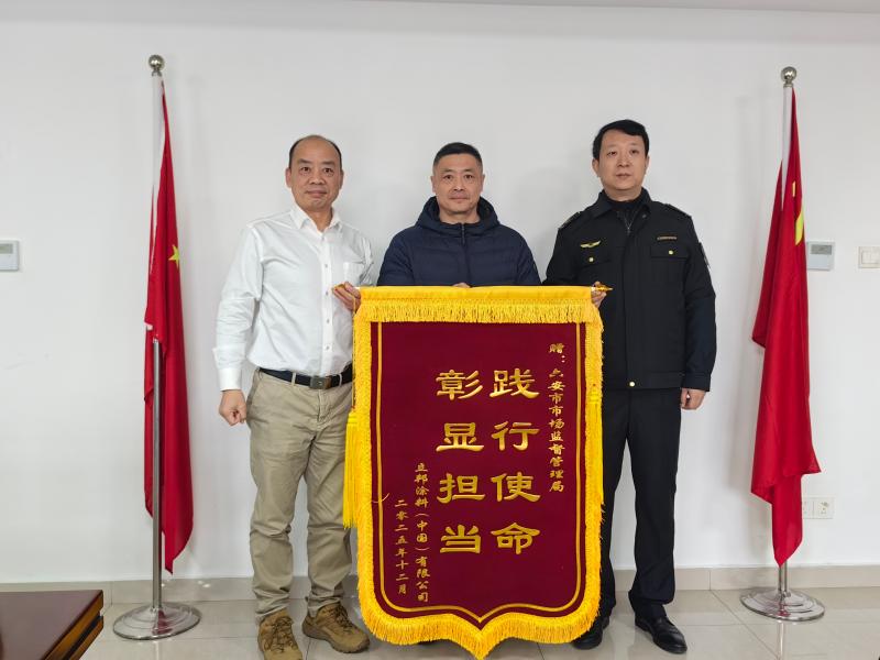 2025年12月31日,涉案商标权利人专程从广州赶赴我局,赠送了一面写有“践行使命、彰显担当”的锦旗。这八个字是对市场监管执法人员恪尽职守、执法为民精神的充分肯定。这已是我局在2025年度知识产权保护执法领域收获的第三面致谢锦旗,折射出市场主体对我市知识产权保护工作的信任与认可。