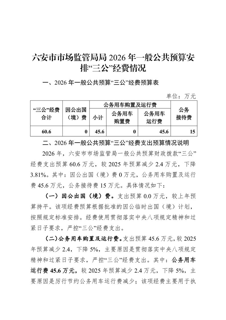 六安市市场监督管理局单位2026年一般公共预算安排“三公”经费情况