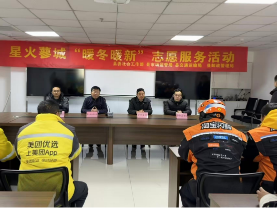 寒冬送暖,岁末传情。1月8日上午,霍邱县委社工部联合县市场监管局、县交通局、县邮政局共同开展星火蓼城“暖冬暖新”志愿服务活动,以实际行动加强对新就业形态劳动者的关心关爱,为在寒风中穿梭奔波的外卖骑手送去温暖与关怀。