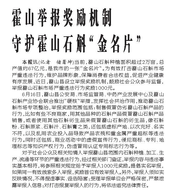 皖西日报:霍山举报奖励机制守护霍山石斛“金名片”