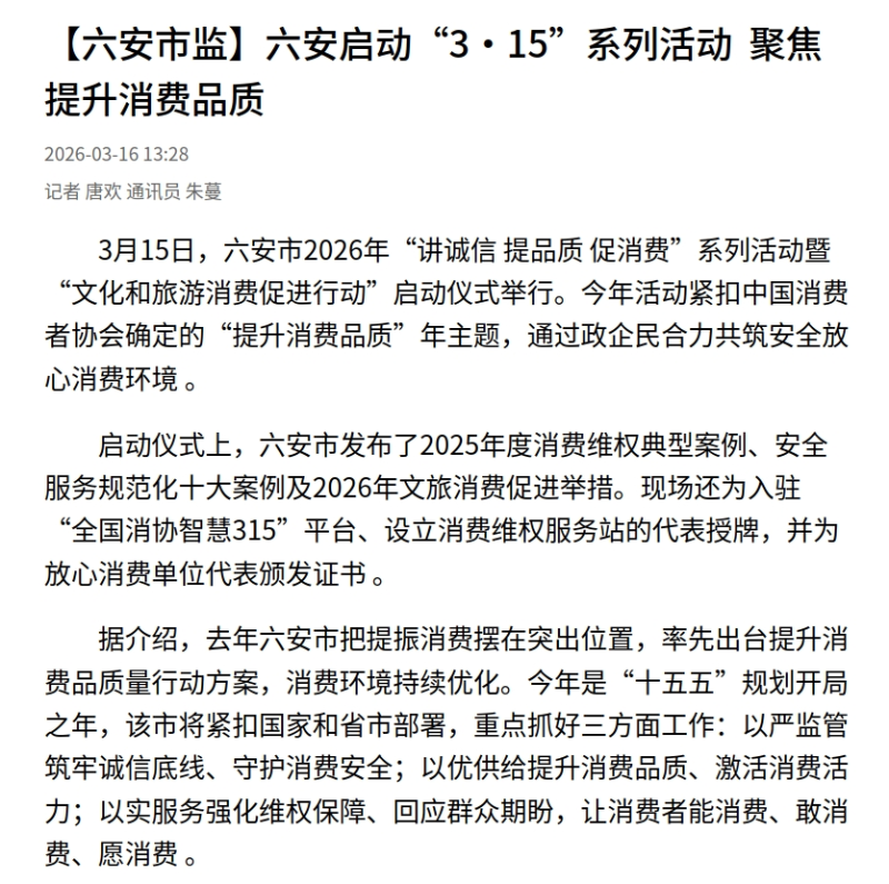 3月15日,六安市2026年“讲诚信 提品质 促消费”系列活动暨“文化和旅游消费促进行动”启动仪式举行。今年活动紧扣中国消费者协会确定的“提升消费品质”年主题,通过政企民合力共筑安全放心消费环境 。