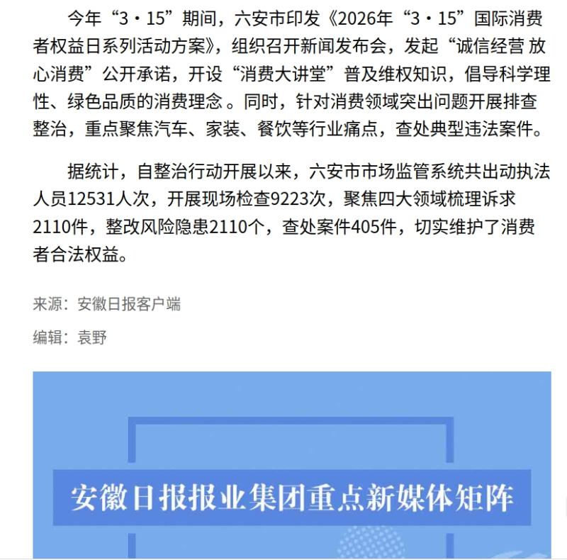 今年“3·15”期间,六安市印发《2026年“3·15”国际消费者权益日系列活动方案》,组织召开新闻发布会,发起“诚信经营 放心消费”公开承诺,开设“消费大讲堂”普及维权知识,倡导科学理性、绿色品质的消费理念 。同时,针对消费领域突出问题开展排查整治,重点聚焦汽车、家装、餐饮等行业痛点,查处典型违法案件。